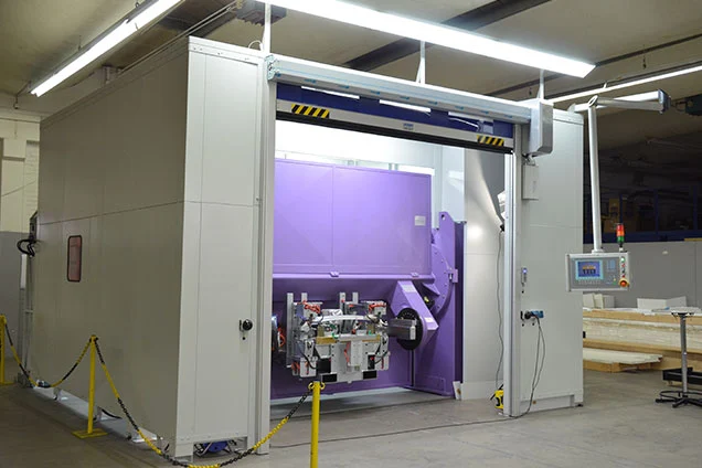 Example: 15 axis custom solution with 2 robots, AC/MIG, VWP, rapid sliding door, floor scanner, User ID controlled